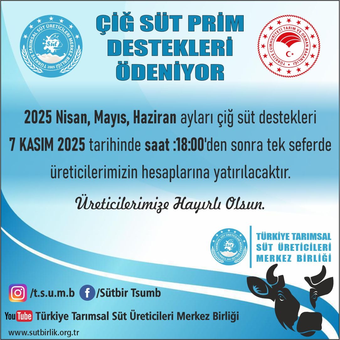 NİSAN, MAYIS VE HAZİRAN AYLARINA AİT SÜT DESTEKLEME ÖDEMELERİ ÜRETİCİLERİMİZİN BANKA HESAPLARINA AKTARILIYOR.